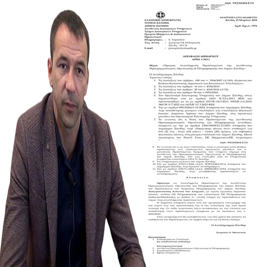 τον       Προϊστάμενο  του      Τμήματος       Πληροφορικής          του      Δήμου Ξάνθης,