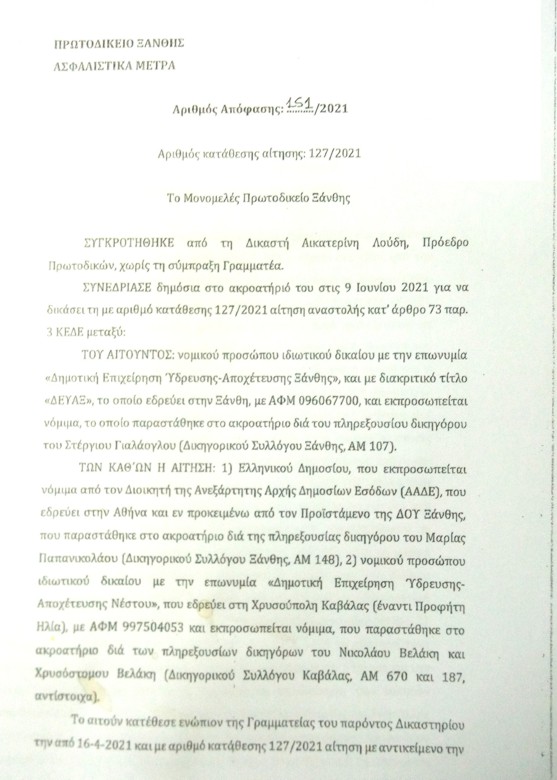 Αναλυτικότερα: Ραγδαίες είναι πλέον από χθες στη ΔΕΥΑΞ, καθώς στα ασφαλιστικά μέτρα που κατέθεσε στο Πρωτοδικείο Ξάνθης, εξεδόθη η με αριθμό 151/2021 (αριθμός κατάθεσης αίτησης 127/2021) του Μονομελούς δικαστηρίου Ξάνθης από την δικαστή Αικατερίνη Λούδη, Πρόεδρο Πρωτοδικών, η απόφαση που δικαίωνε πανηγυρικά τον Δήμο Νέστου και το Ελληνικό Δημόσιο (ΑΑΔΕ), με αποτέλεσμα ο μεν Δήμαρχος Νέστου και Πρόεδρος Σάββας Μιχαηλίδης να πανηγυρίζει, η δε ΔΕΥΑΞ να κάθεται πλέον στο εδώλιο (σ.σ. Με βάση την συγκεκριμένη απόφαση 151/20921) και να καλούνται χθες από την Εισαγγελία Ξάνθης και οι τρεις Πρόεδροι με τα διοικητικά τους συμβούλια στη ΔΕΥΑΞ από τα έτη 2006 μέχρι και τις 9 Ιουνίου 2021 που συνεδρίασε το δικαστήριο!!!