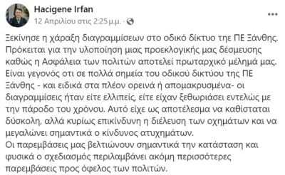 -Συμφωνώ Άρη ότι το αποτέλεσμα μετράει, αλλά να μην αδικούμε και τον Αντιπεριφερειάρχη Μεταφορών Ιρφάν Χατζηγκενέ που πήρε την πρωτοβουλία και ανακοίνωσε μάλιστα με δελτίο τύπου τις διαγραμμίσεις στον Περιφερειακό δρόμο Ξάνθης – Ορεινή περιοχή.