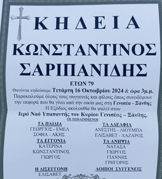 *Επίσης την Τετάρτη 16 Οκτωβρίου στις 3 το μεσημέρι, η Γενισέα αποχαιρέτισε με δάκρυα στα μάτια τον αγωνιστή του ΠΑΚ και του ΠΑΣΟΚ Κώστα Σαρηπανίδη που έγραψε την δική του ιστορία στη Ξάνθη και κατέβηκε υποψήφιο Πρόεδρος στην Κοινότητα Γενισέας τουλάχιστον 3 φορές κόντρα στον πρώην Πρόεδρο κ.Ρούρο.
