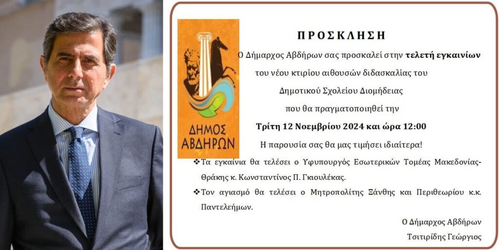 «O Δήμαρχος Αβδήρων σας προσκαλεί στην τελετή εγκαινίων του νέου κτιρίου αιθουσών διδασκαλίας του Δημοτικού Σχολείου Διομήδειας που θα πραγματοποιηθεί την Τρίτη 12 Νοεμβρίου 2024 και ώρα 12:00.