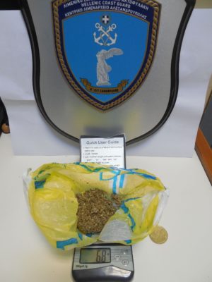 Επιπλέον σε έρευνες που πραγματοποιήθηκαν από τα εν λόγω στελέχη του Λ.Σ.-ΕΛ.ΑΚΤ., βρέθηκαν στο χερσαίο χώρο του λιμένα, μέσα σε κάδο απορριμάτων μία πλαστική συσκευασία η οποία περιείχε καπνό αναμεμειγμένο με υπολείμματα φυτικής κάνναβης συνολικού βάρους 139,1 γραμμάρια και 2 τρίφτες με υπολείμματα ακατέργαστης κάνναβης.