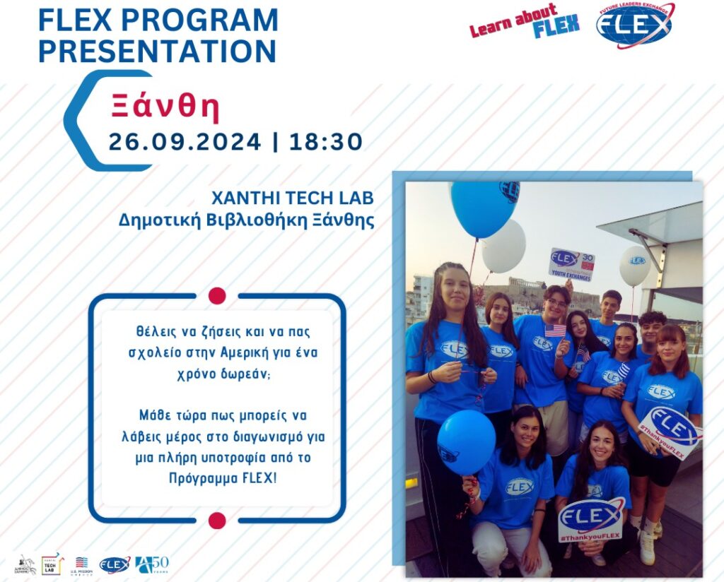 Για άλλη μια χρονιά διαφημίζεται φέτος στα σχολεία η λειτουργία του προγράμματος «Future Leaders Exchange» (FLEX), του υπουργείου Εξωτερικών των ΗΠΑ, που οργανώνεται από τα Αμερικανικά Συμβούλια για τη Διεθνή Εκπαίδευση. Μάλιστα ο Δήμος Ξάνθης μαζί με το xanthitechlab οργανώνει και εκδήλωση προβολής του προγράμματος εν μέσω της νέας κλιμάκωσης στη Μέση Ανατολή από το κράτος – δολοφόνο του Ισραήλ με τις πλάτες των ΗΠΑ.