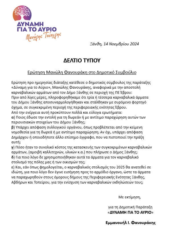 Ερώτηση προ ημερησίας διάταξης κατέθεσε ο δημοτικός σύμβουλος της παράταξης «Δύναμη για το Αύριο», Μανώλης Φανουράκης, αναφορικά με την αποστολή καρναβαλικών αρμάτων από τον Δήμο Ξάνθης σε περιοχή της ΠΕ Έβρου: