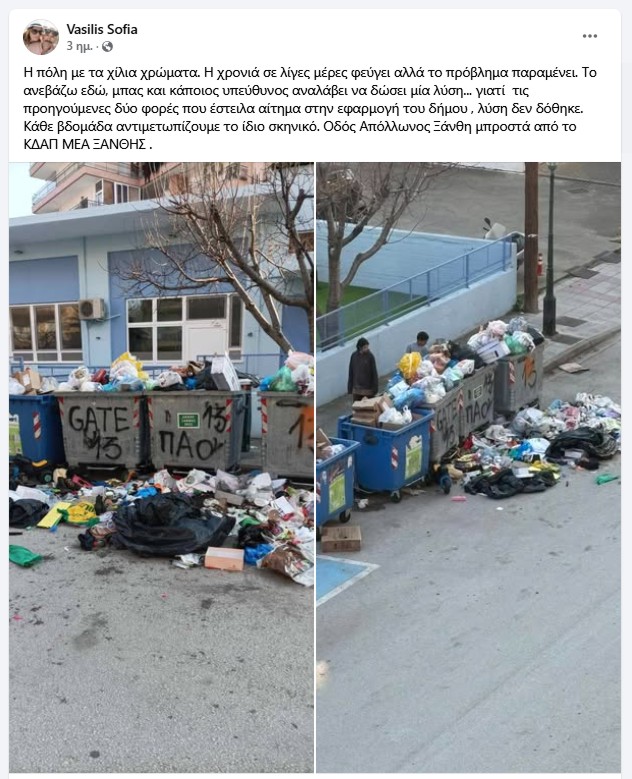 Η πόλη με τα χίλια χρώματα. Η χρονιά σε λίγες μέρες φεύγει αλλά το πρόβλημα παραμένει. Το ανεβάζω εδώ, μπας και κάποιος υπεύθυνος αναλάβει να δώσει μία λύση… γιατί τις προηγούμενες δύο φορές που έστειλα αίτημα στην εφαρμογή του δήμου, λύση δεν δόθηκε. Κάθε βδομάδα αντιμετωπίζουμε το ίδιο σκηνικό. Οδός Απόλλωνος Ξάνθη μπροστά από το ΚΔΑΠ ΜΕΑ ΞΑΝΘΗΣ.