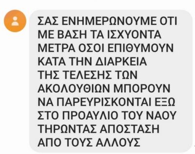 - Σε περίπτωση ζεύγους με ανήλικα τέκνα, επιτρέπεται η ομαδική παρουσία τους έξω από την εκκλησία, τηρώντας απόσταση δύο μέτρων από τις υπόλοιπες ομάδες.