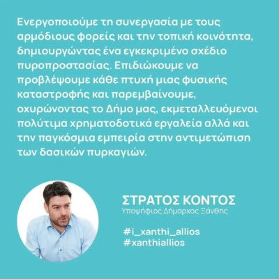 *”Ενεργοποιούμε τη συνεργασία με τους αρμόδιους φορείς και την τοπική κοινότητα, δημιουργώντας ένα εγκεκριμένο σχέδιο πυροπροστασίας. Επιδιώκουμε να προβλέψουμε κάθε πτυχή μιας φυσικής καταστροφής και παρεμβαίνουμε, οχυρώνοντας το Δήμο μας, εκμεταλλευόμενοι πολύτιμα χρηματοδοτικά εργαλεία αλλά και την παγκόσμια εμπειρία στην αντιμετώπιση των δασικών πυρκαγιών.” σημειώνει σε χθεσινή ανάρτηση του.