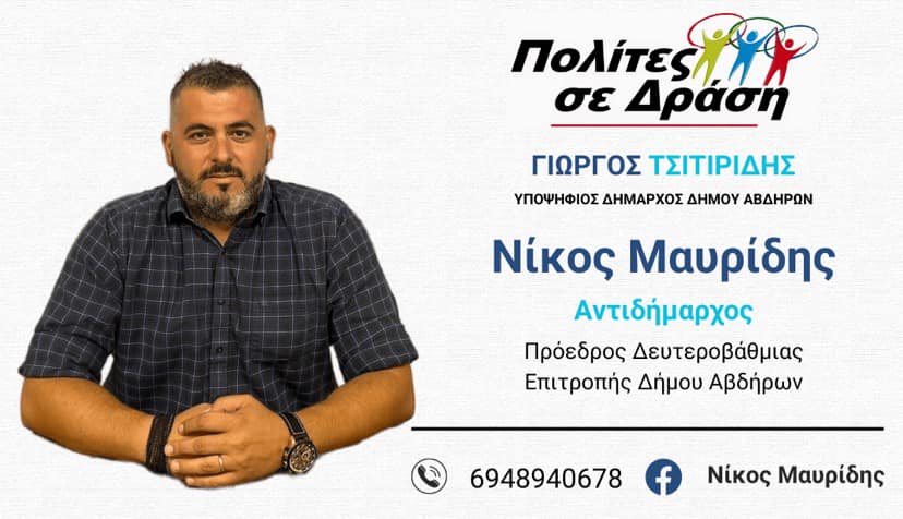 Και ο Νίκος Μαυρίδης, μπήκε ενεργά στον αγώνα και κατεβαίνει υποψήφιος δημοτικός σύμβουλος Αβδήρων με το ψηφοδέλτιο φυσικά του Δήμαρχου Αβδήρων Γιώργου Τσιτιρίδη.