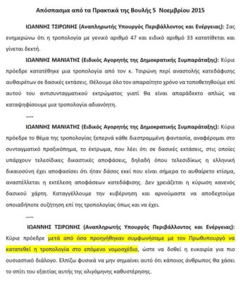 *Ο κ. Μανιάτης στην ανάρτησή του δημοσιοποιεί και την συζήτηση από τα πρακτικά, όπου ο αναπληρωτής υπουργός Περιβάλλοντος Γιάννης Τσιρώνης αναφέρει χαρακτηριστικά: «Μετά τα όσα προηγήθησαν συμφωνήσαμε με τον πρωθυπουργό η συγκεκριμένη τροπολογία να κατατεθεί σε επόμενο νομοσχέδιο».