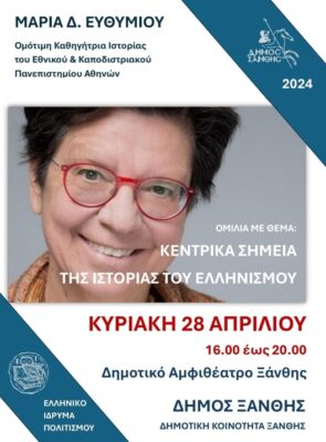 *Ο Δήμος Ξάνθης και η Δημοτική Κοινότητα Ξάνθης, σας προσκαλούν στην ομιλία της Μαρίας Ευθυμίου, Ομότιμης καθηγήτριας Ιστορίας του Εθνικού & Καποδιστριακού Πανεπιστημίου Αθηνών, την Κυριακή 28 Απριλίου 2024 στις 16.00, με θέμα: Κεντρικά σημεία της ιστορίας του Ελληνισμού.