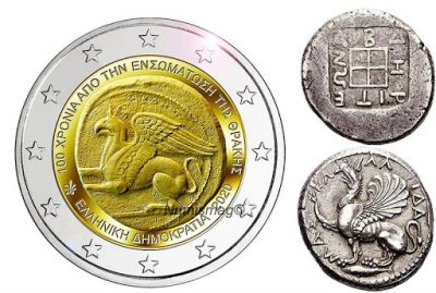 Στο επετειακό νόμισμα, απεικονίζεται ένα αρχαίο νόμισμα από τα Άβδηρα με έναν γρύπα, δηλαδή ένα ορνιθομορφικό μυθικό πλάσμα ενώ περιμετρικά αναγράφονται οι λέξεις «100 χρόνια από την ενσωμάτωση της Θράκης» και «Ελληνική Δημοκρατία 2020». Το συγκεκριμένο θα κυκλοφορήσει σε 743,000 κομμάτια όποτε ίσως φτάσει στα χέρια μας ίσως και όχι.