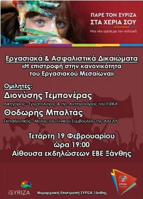*Η Ν.Ε. του ΣΥΡΙΖΑ Ξάνθης σας προσκαλεί στην εκδήλωση – συζήτηση με τους Διονύση Τεμπονέρα και Θοδωρή Μπαλτά με θέμα «Η επιστροφή στην κανονικότητα του Εργασιακού Μεσαίωνα» που θα πραγματοποιηθεί την Τετάρτη 19 Φεβρουαρίου στις 19:00 στην Αίθουσα του ΕΒΕ Ξάνθης.