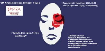 *Πρόσκληση. «Σας προσκαλούμε στην εκδήλωση που θα πραγματοποιηθεί την Παρασκευή 26 Νοεμβρίου 2021 στις 18:30 με τίτλο «Έμφυλη Βία: Όψεις, Θέσεις, Αντιθέσεις» με ομιλήτρια την καθηγήτρια Νομικής του ΑΠΘ κυρία Ιφιγένεια Καμτσίδου στο Ίδρυμα Θρακικής Τέχνης και Παράδοσης «Καπναποθήκη Π». Η παρουσία σας θα μας τιμήσει ιδιαίτερα.»