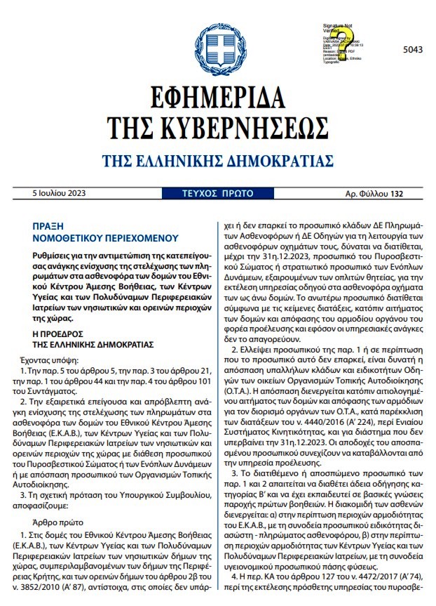 Με Πράξη Νομοθετικού Περιεχομένου (ΠΝΟ), που υπογράφει η Πρόεδρος της Δημοκρατίας, ρυθμίζεται η αντιμετώπιση της κατεπείγουσας ανάγκης ενίσχυσης της στελέχωσης των πληρωμάτων στα ασθενοφόρα των δομών του Εθνικού Κέντρου Άμεσης Βοήθειας (ΕΚΑΒ), των Κέντρων Υγείας και των Πολυδύναμων Περιφερειακών Ιατρείων των νησιωτικών και ορεινών περιοχών της χώρας.
