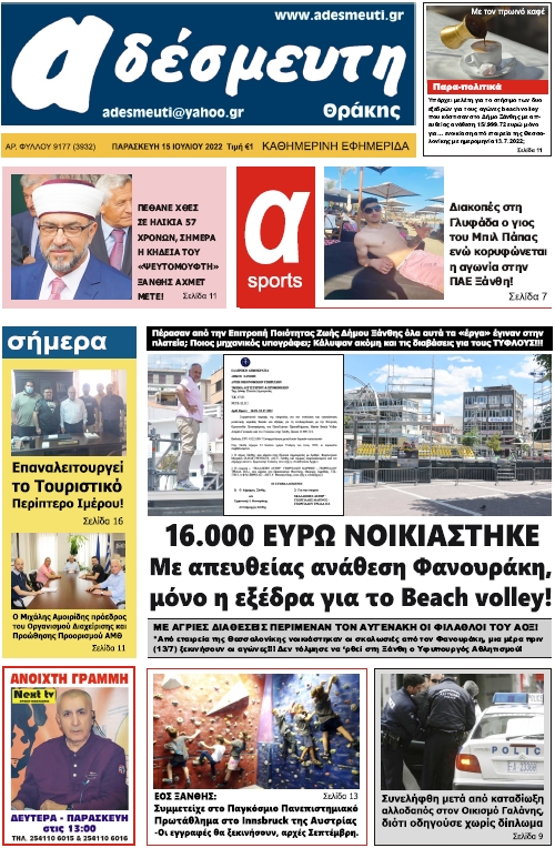 ΠΡΩΤΟΣΕΛΙΔΟ ΠΑΡΑΣΚΕΥΗ 15 ΙΟΥΛΙΟΥ 2022