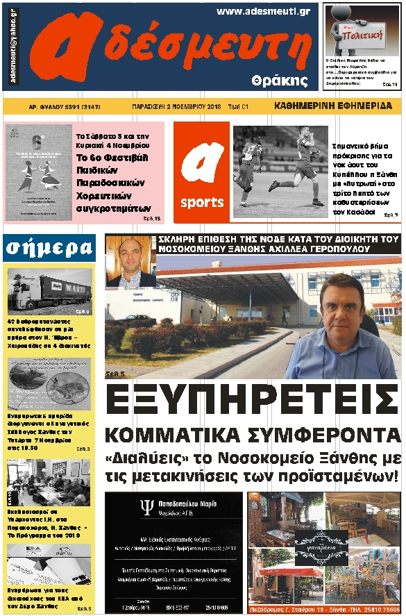 ΠΡΩΤΟΣΕΛΙΔΟ ΠΑΡΑΣΚΕΥΗ 2 ΝΟΕΜΒΡΙΟΥ 2018