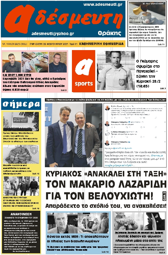 ΠΡΩΤΟΣΕΛΙΔΟ ΠΑΡΑΣΚΕΥΗ 26 ΦΕΒΡΟΥΑΡΙΟΥ 2021
