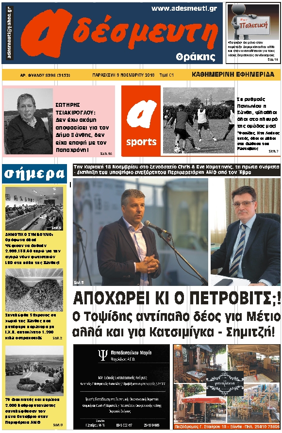 ΠΡΩΤΟΣΕΛΙΔΟ ΠΑΡΑΣΚΕΥΗ 9 ΝΟΕΜΒΡΙΟΥ 2018