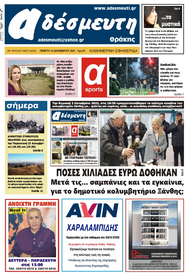 ΠΡΩΤΟΣΕΛΙΔΟ ΠΕΜΠΤΗ 14 ΔΕΚΕΜΒΡΙΟΥ 2023