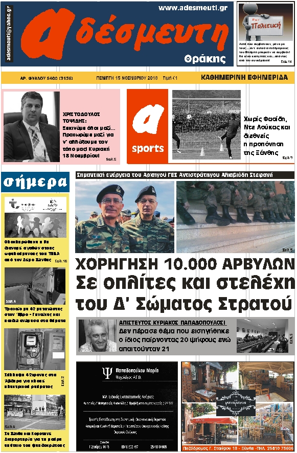 ΠΡΩΤΟΣΕΛΙΔΟ ΠΕΜΠΤΗ 15 ΝΟΕΜΒΡΙΟΥ 2018