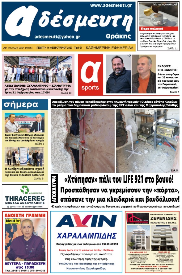 ΠΡΩΤΟΣΕΛΙΔΟ ΠΕΜΠΤΗ 16 ΦΕΒΡΟΥΑΡΙΟΥ 2023
