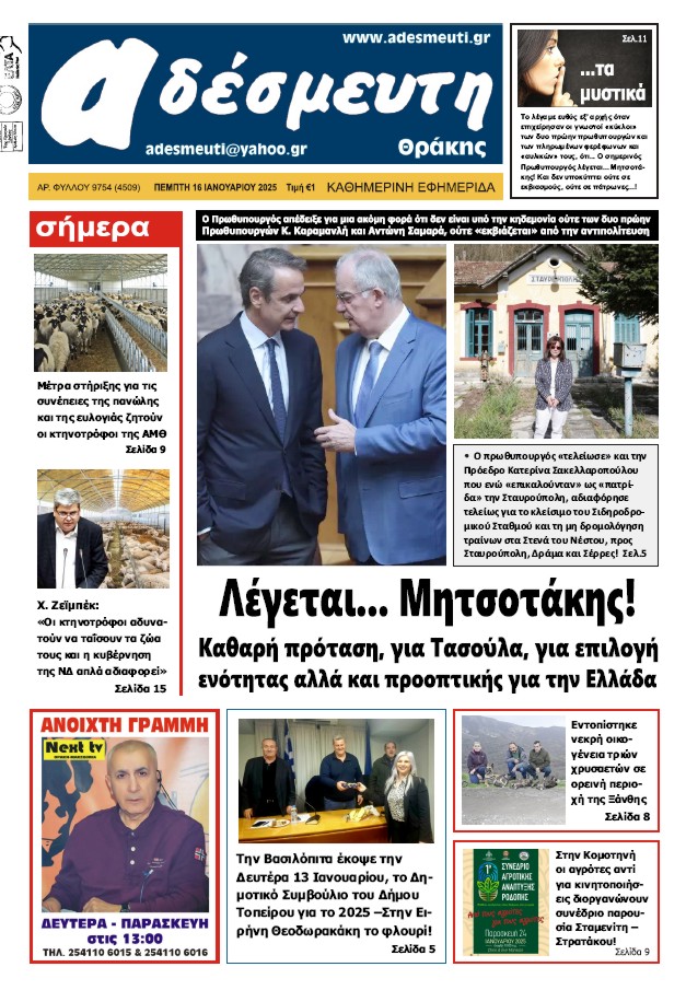ΠΡΩΤΟΣΕΛΙΔΟ ΠΕΜΠΤΗ 16 ΙΑΝΟΥΑΡΙΟΥ 2025