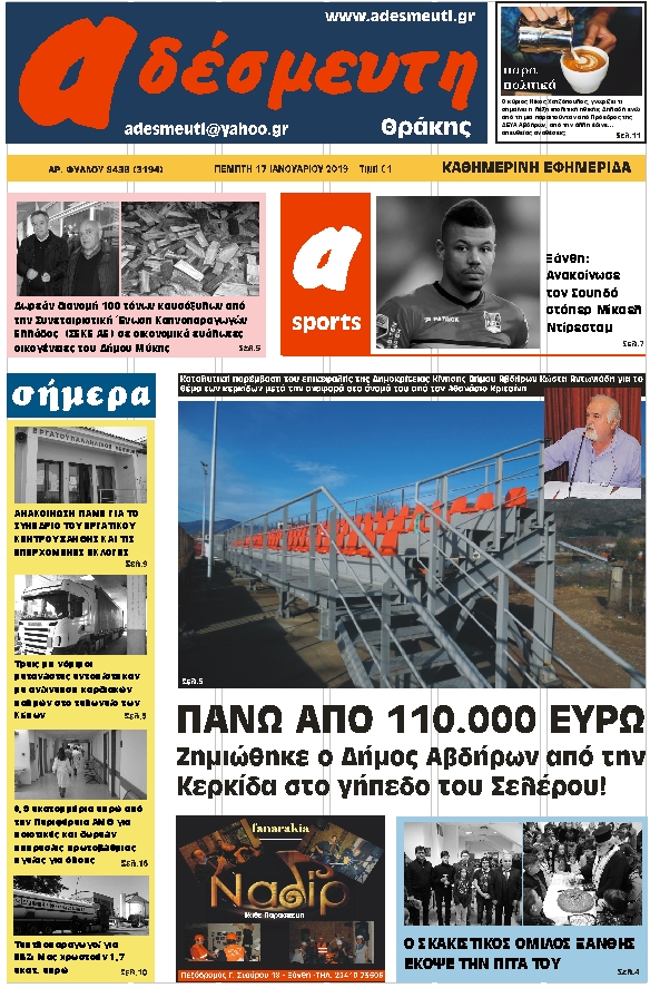 ΠΡΩΤΟΣΕΛΙΔΟ ΠΕΜΠΤΗ 17 ΙΑΝΟΥΑΡΙΟΥ 2019