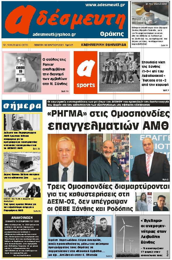 ΠΡΩΤΟΣΕΛΙΔΟ ΠΕΜΠΤΗ 18 ΜΑΡΤΙΟΥ 2021