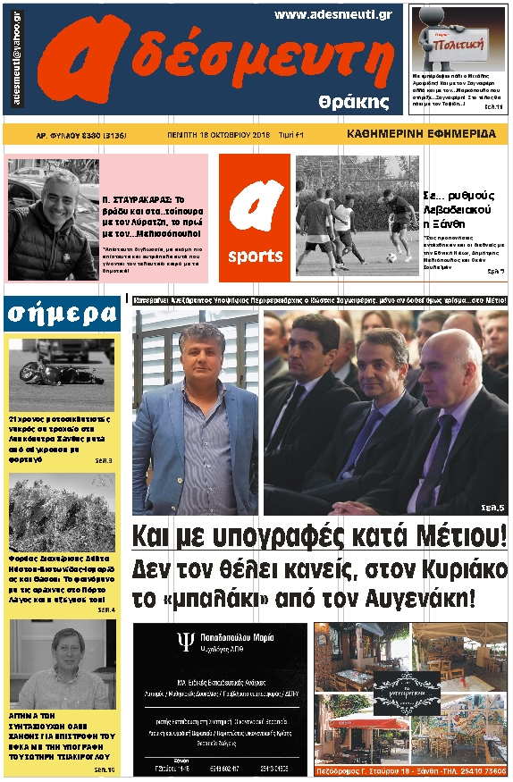 ΠΡΩΤΟΣΕΛΙΔΟ ΠΕΜΠΤΗ 18 ΟΚΤΩΒΡΙΟΥ 2018
