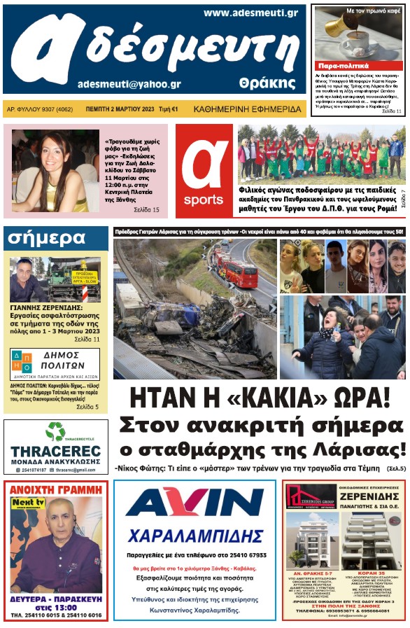 ΠΡΩΤΟΣΕΛΙΔΟ ΠΕΜΠΤΗ 2 ΜΑΡΤΙΟΥ 2023