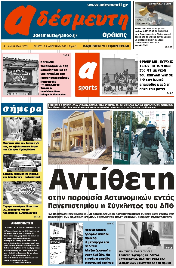 ΠΡΩΤΟΣΕΛΙΔΟ ΠΕΜΠΤΗ 21 ΙΑΝΟΥΑΡΙΟΥ 2021