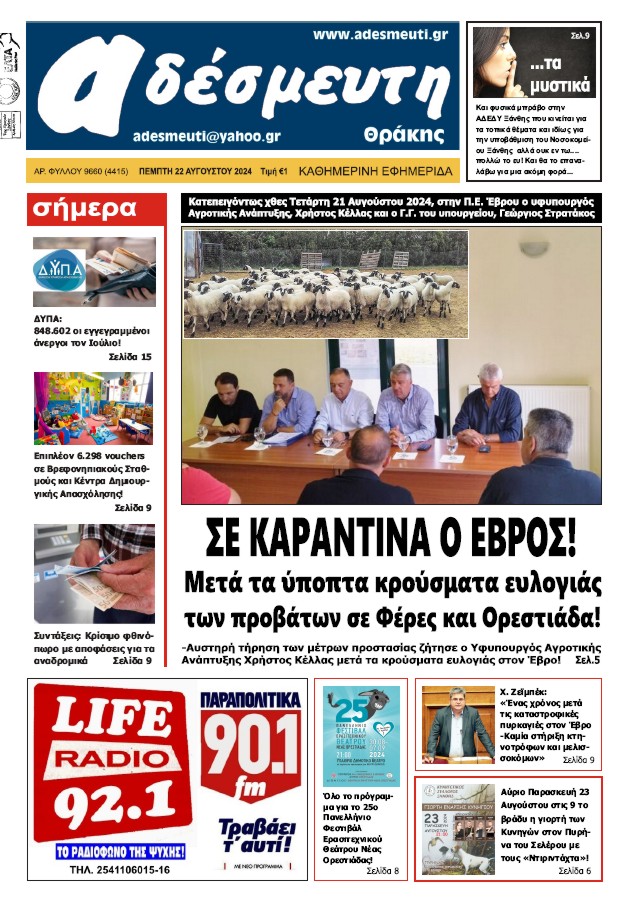 ΠΡΩΤΟΣΕΛΙΔΟ ΠΕΜΠΤΗ 22 ΑΥΓΟΥΣΤΟΥ 2024