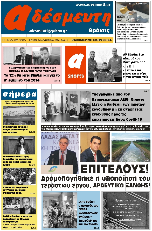 ΠΡΩΤΟΣΕΛΙΔΟ ΠΕΜΠΤΗ 24 ΔΕΚΕΜΒΡΙΟΥ 2020