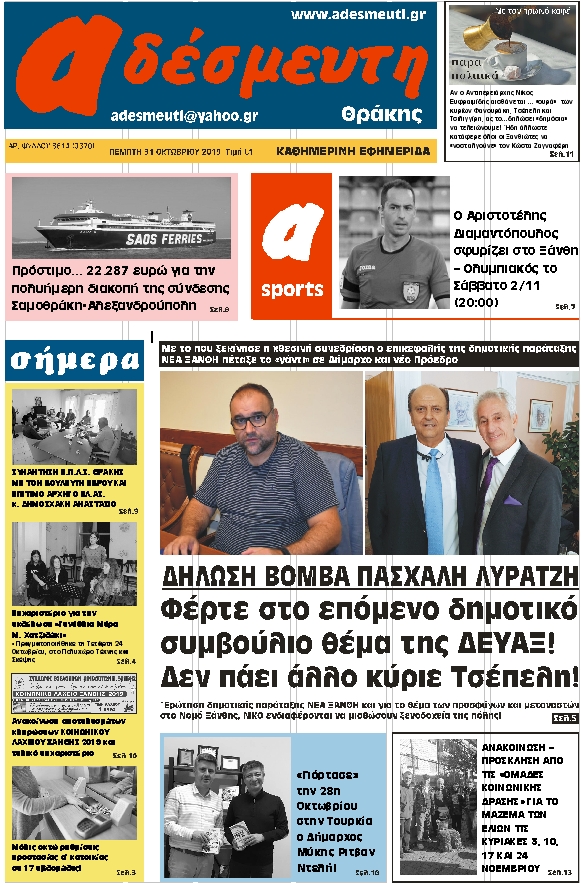 ΠΡΩΤΟΣΕΛΙΔΟ ΠΕΜΠΤΗ 31 ΟΚΤΩΒΡΙΟΥ 2019
