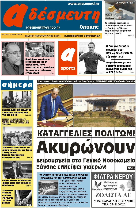 ΠΡΩΤΟΣΕΛΙΔΟ ΠΕΜΠΤΗ 6 ΦΕΒΡΟΥΑΡΙΟΥ 2020