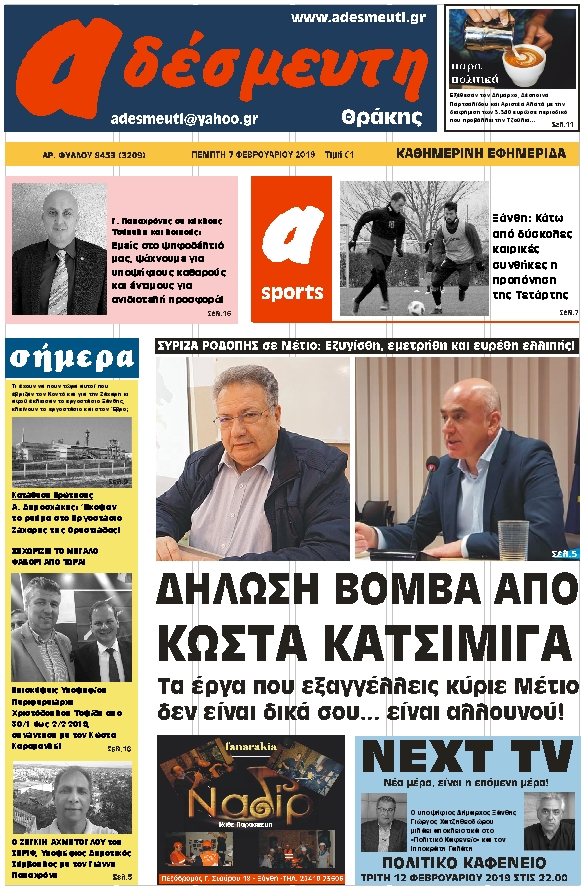 ΠΡΩΤΟΣΕΛΙΔΟ ΠΕΜΠΤΗ 7 ΦΕΒΡΟΥΑΡΙΟΥ 2019