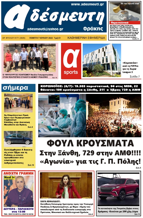 ΠΡΩΤΟΣΕΛΙΔΟ ΠΕΜΠΤΗ 7 ΙΟΥΛΙΟΥ 2022