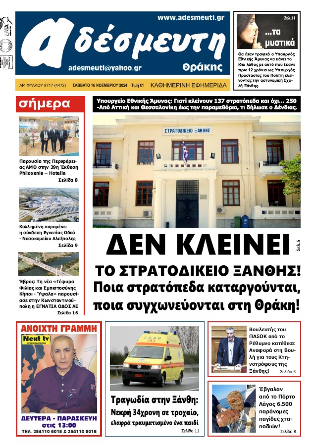ΠΡΩΤΟΣΕΛΙΔΟ ΣΑΒΒΑΤΟ 16 ΝΟΕΜΒΡΙΟΥ 2024