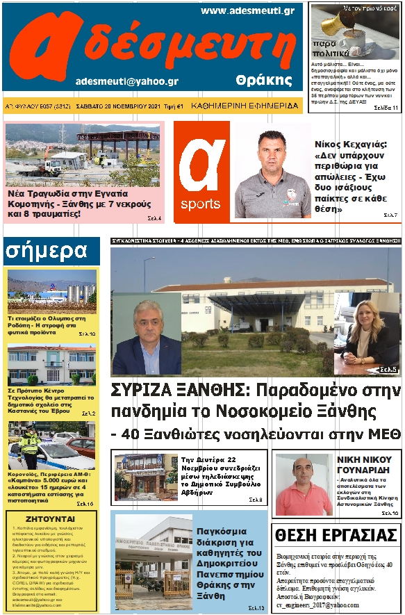 ΠΡΩΤΟΣΕΛΙΔΟ ΣΑΒΒΑΤΟ 20 ΝΟΕΜΒΡΙΟΥ 2021