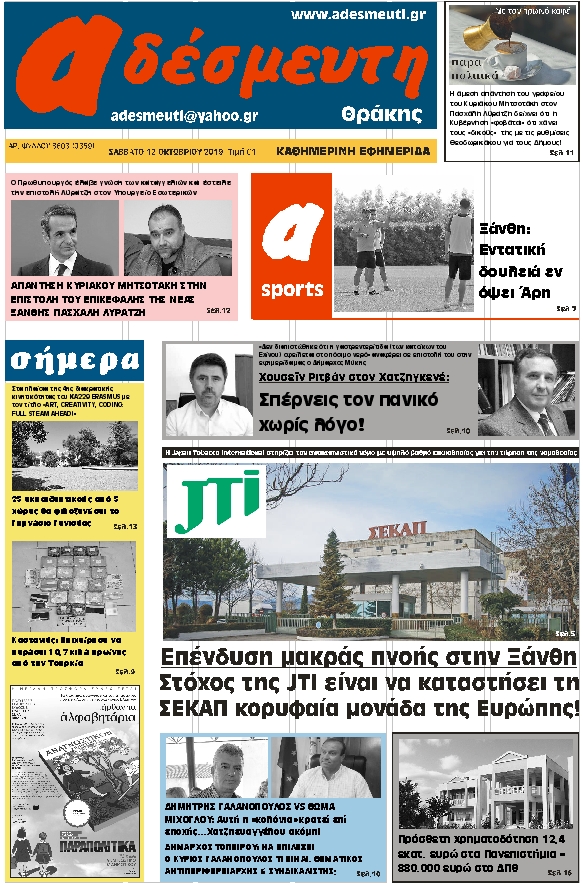 ΠΡΩΤΟΣΕΛΙΔΟ ΣΑΒΒΑΤΟ 12 ΟΚΤΩΒΡΙΟΥ 2019