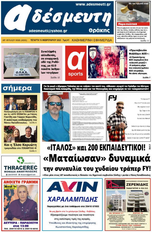 ΠΡΩΤΟΣΕΛΙΔΟ ΤΕΤΑΡΤΗ 15 ΦΕΒΡΟΥΑΡΙΟΥ 2023
