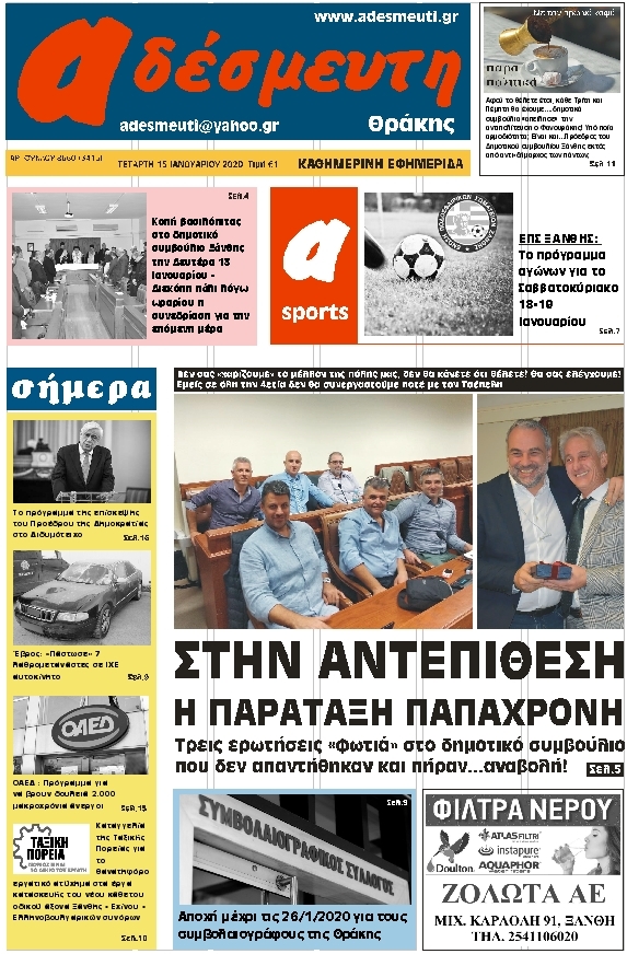 ΠΡΩΤΟΣΕΛΙΔΟ ΤΕΤΑΡΤΗ 15 ΙΑΝΟΥΑΡΙΟΥ 2020