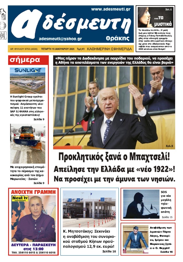 ΠΡΩΤΟΣΕΛΙΔΟ ΤΕΤΑΡΤΗ 15 ΙΑΝΟΥΑΡΙΟΥ 2025