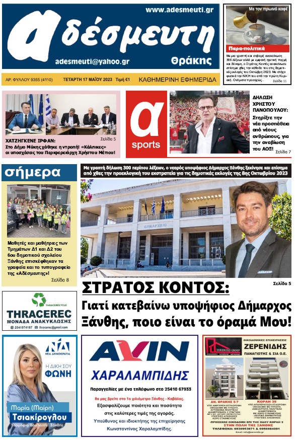 ΠΡΩΤΟΣΕΛΙΔΟ ΤΕΤΑΡΤΗ 17 ΜΑΪΟΥ 2023