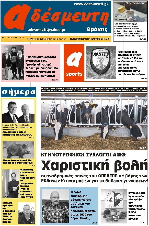 ΠΡΩΤΟΣΕΛΙΔΟ ΤΕΤΑΡΤΗ 18 ΔΕΚΕΜΒΡΙΟΥ 2019
