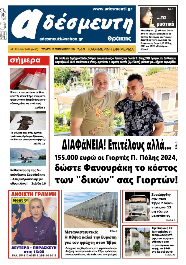 ΠΡΩΤΟΣΕΛΙΔΟ ΤΕΤΑΡΤΗ 18 ΣΕΠΤΕΜΒΡΙΟΥ 2024