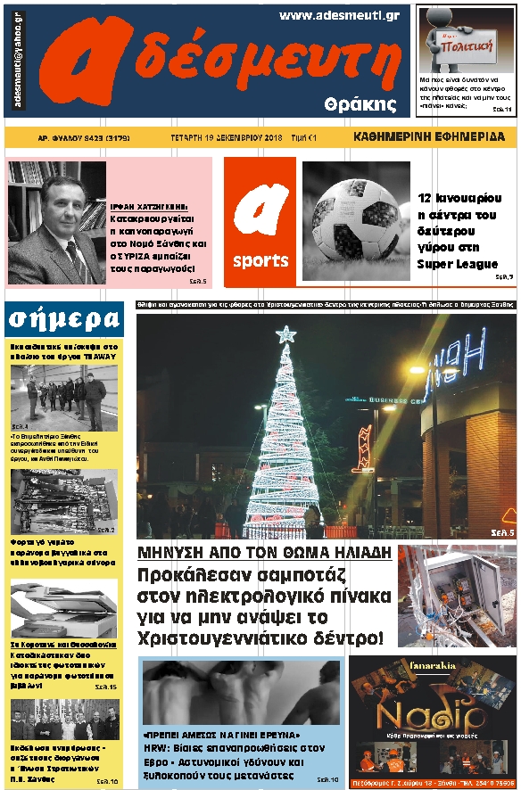ΠΡΩΤΟΣΕΛΙΔΟ ΤΕΤΑΡΤΗ 19 ΔΕΚΕΜΒΡΙΟΥ 2018