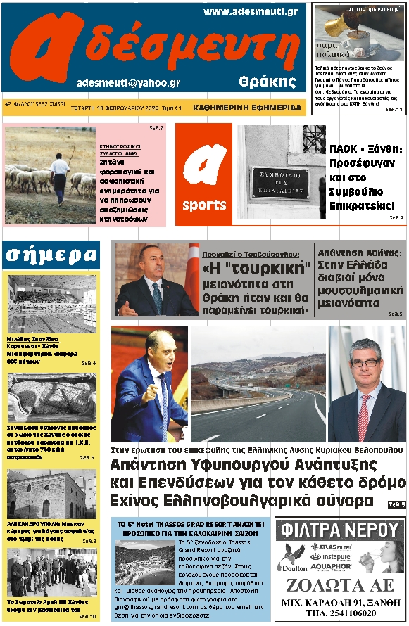 ΠΡΩΤΟΣΕΛΙΔΟ ΤΕΤΑΡΤΗ 19 ΦΕΒΡΟΥΑΡΙΟΥ 2020