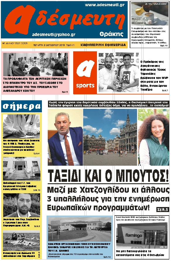 ΠΡΩΤΟΣΕΛΙΔΟ ΤΕΤΑΡΤΗ 2 ΟΚΤΩΒΡΙΟΥ 2019