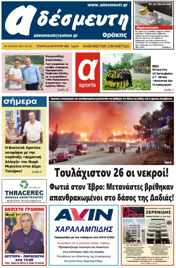 ΠΡΩΤΟΣΕΛΙΔΟ ΤΕΤΑΡΤΗ 23 ΑΥΓΟΥΣΤΟΥ 2023